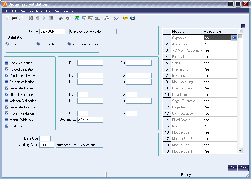 2、开发>工具>字典>审核(Development>Utilities>Dictionary>Validation),选择需要修正的folder名,审核所有与STT这个activity code有关的元素,如下图: