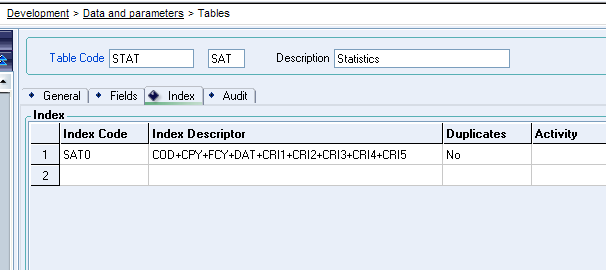 3、审核完毕后,到开发>数据和参数>表(Development>Data and Parameters>Tables)中,找到STAT(SAT)这张表,查看其Index,原始的Index应该为COD+CPY+FCY+DAT+CRI1+CRI2+CRI3+CRI4,改为COD+CPY+FCY+DAT+CRI1+CRI2+CRI3+CRI4+CRI5,即把Index增加一个字段CRI5,保存并审核此表。