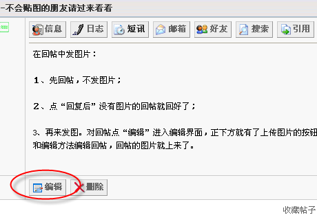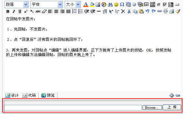 3、再来发图。对回帖点“编辑”进入编辑界面,正下方就有了上传图片的按钮,OK,按照发帖的上传和编辑方法编辑回帖,回帖的图片就上来了。