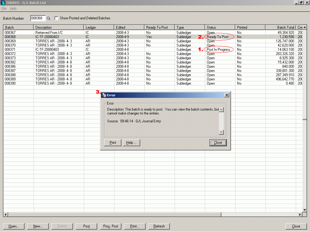 运行重启维护,得到最后一条记录为:“程序名称:GL0030;重启编号:5,490;讯息:批次范围000116到000116的预过账发生错误。请重新启动。如此批次清单的批次状态为‘正在过账’,请再次调用‘过账’将其完成”。